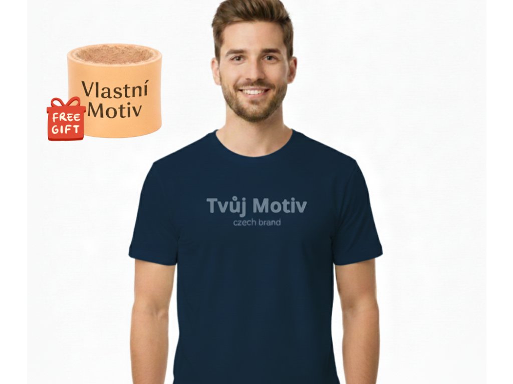 10 tmavě modrých triček s vlastním motivem + 10 malých kožených turbánků s vlastním motivem ZDARMA